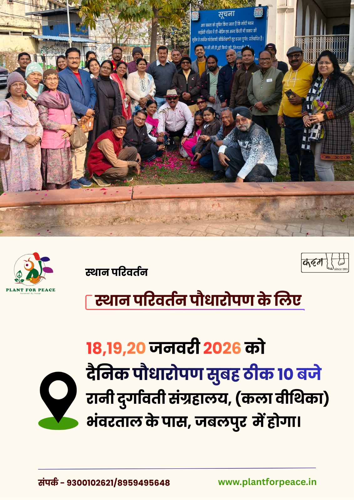 17 January स्थान परिवर्तन पौधारोपण के लिए JABALPUR 18,19,20 जनवरी 2026 को दैनिक पौधारोपण सुबह ठीक 10 बजे रानी दुर्गावती संग्रहालय, (कला वीथिका) भंवरताल के पास जबलपुर मे होग़ा Share With: facebook twitter Whatsapp google+